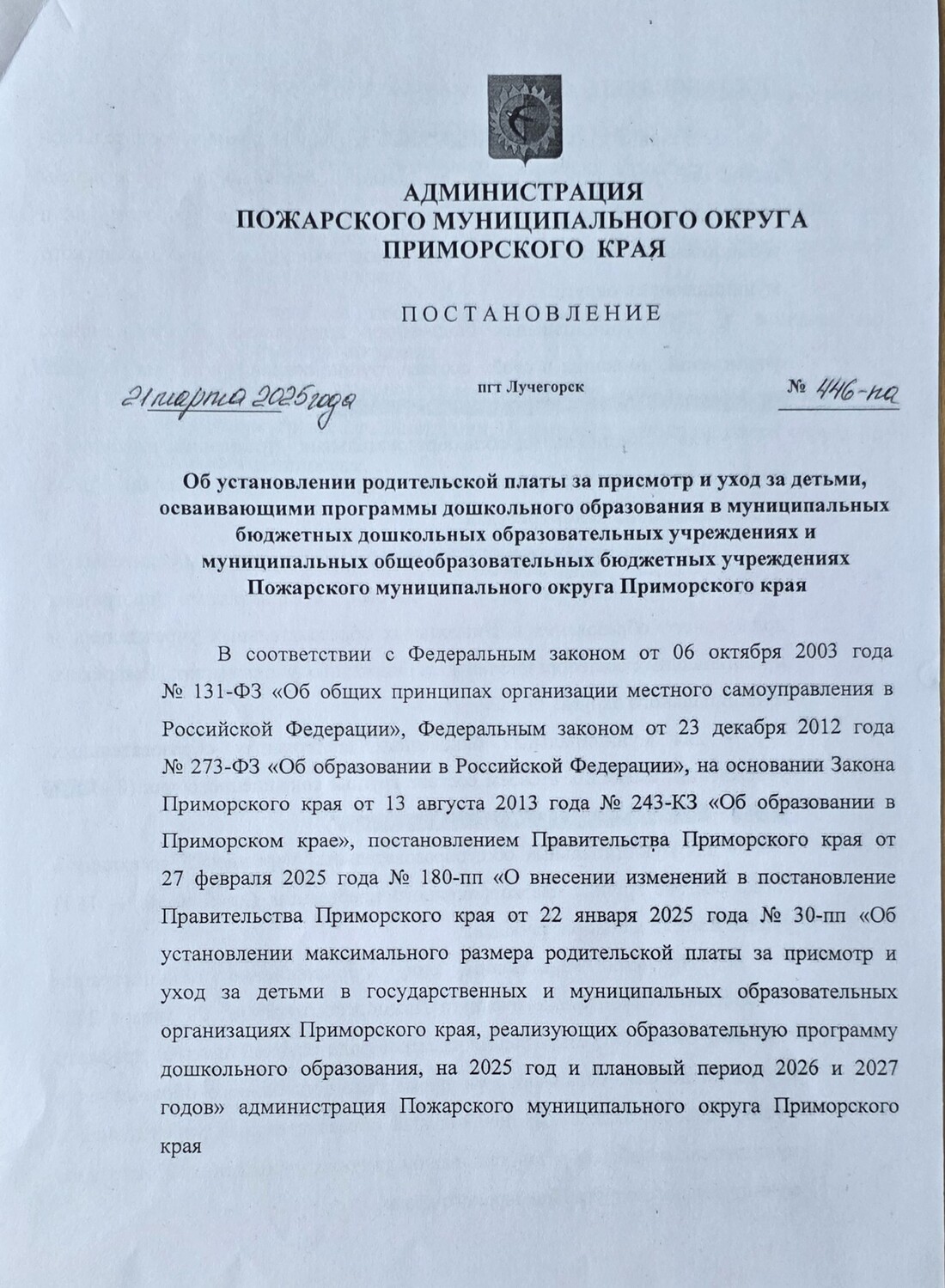 АДМИНИСТРАЦИЯ ПОЖАРСКОГО МУНИЦИПАЛЬНОГО ОКРУГА ПРИМОРСКОГО КРАЯ П О С Т А Н О В Л Е Н И Е Об утверждении Положения о взимании и расходовании родительской платы за присмотр и уход за детьми, осваивающими программы дошкольного образования в муниципальных бюджетных дошкольных образовательных учреждениях и муниципальных общеобразовательных бюджетных учреждениях Пожарского муниципального округа
